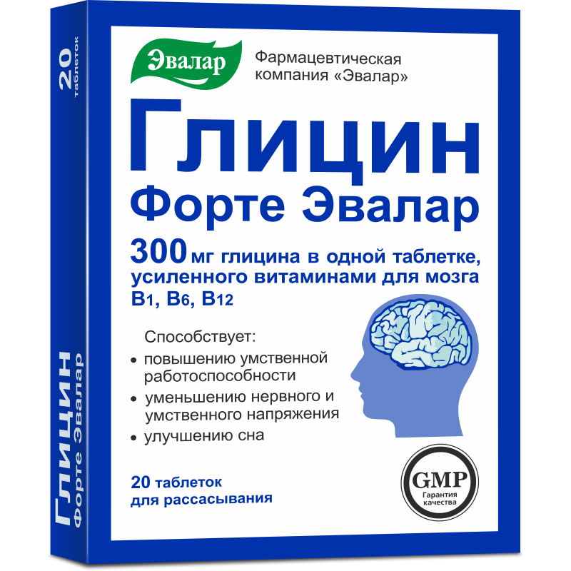 Активное вещество: глицин, цианокобаламин (витамин В12), пиридоксина гидрохлорид (витамин В6), тиамина гидрохлорид (витамин В1).Глицин Форте Эвалар отличается высоким содержанием глицина (300 мг). В норме у человека преобладает влияние парасимпатической нервной системы, что способствует спокойствию. Однако при длительной нервной нагрузке баланс может нарушаться, и активность симпатической нервной системы возрастает, что приводит к состоянию перевозбуждения. Это может вызывать снижение концентрации, беспокойство и трудности в решении сложных задач. Умственное напряжение и проблемы со сном могут истощать нервную систему.