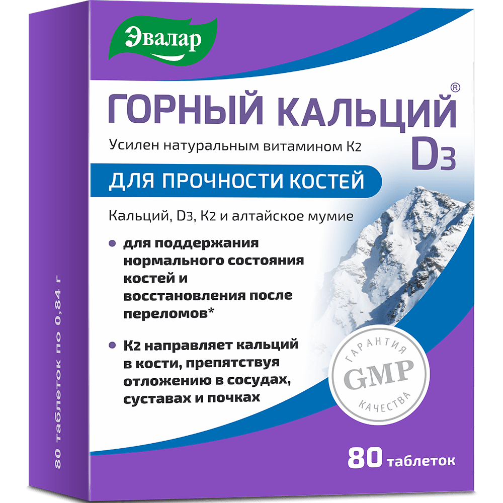 Горный кальций с витамином D3 и мумие удовлетворяет суточные потребности организма в кальции и витамине D3. Мумие, содержащее более 30 макро- и микроэлементов, выступает естественным катализатором, способствующим доставке кальция в костную ткань и улучшению ее структуры.